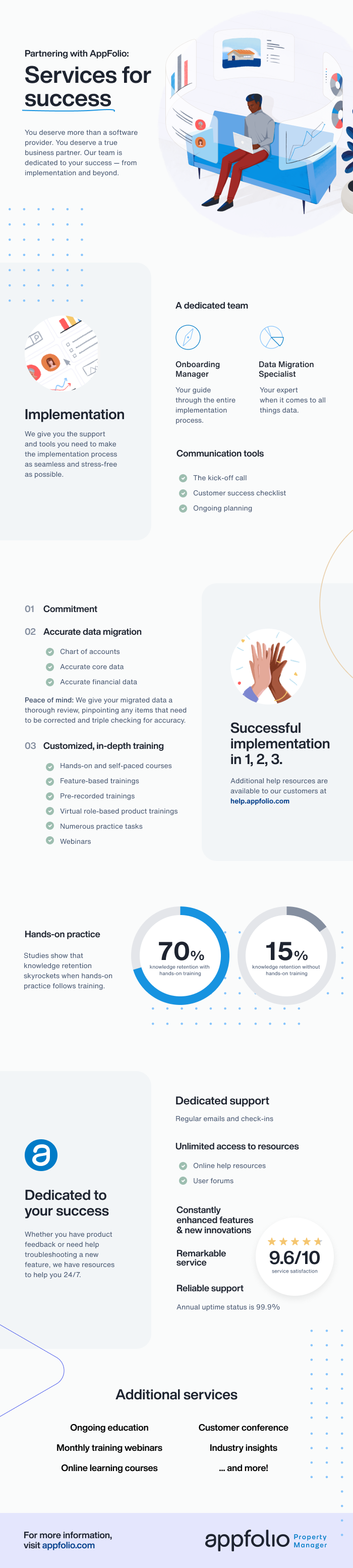 Whether you are already an AppFolio customer, or just beginning to explore property management software solutions, the infographic below serves as a complete overview of what it’s like to experience AppFolio’s service from implementation and beyond! It also provides a snapshot of the many teams we have that are here solely to ensure our customers’ success and satisfaction. Check it out: